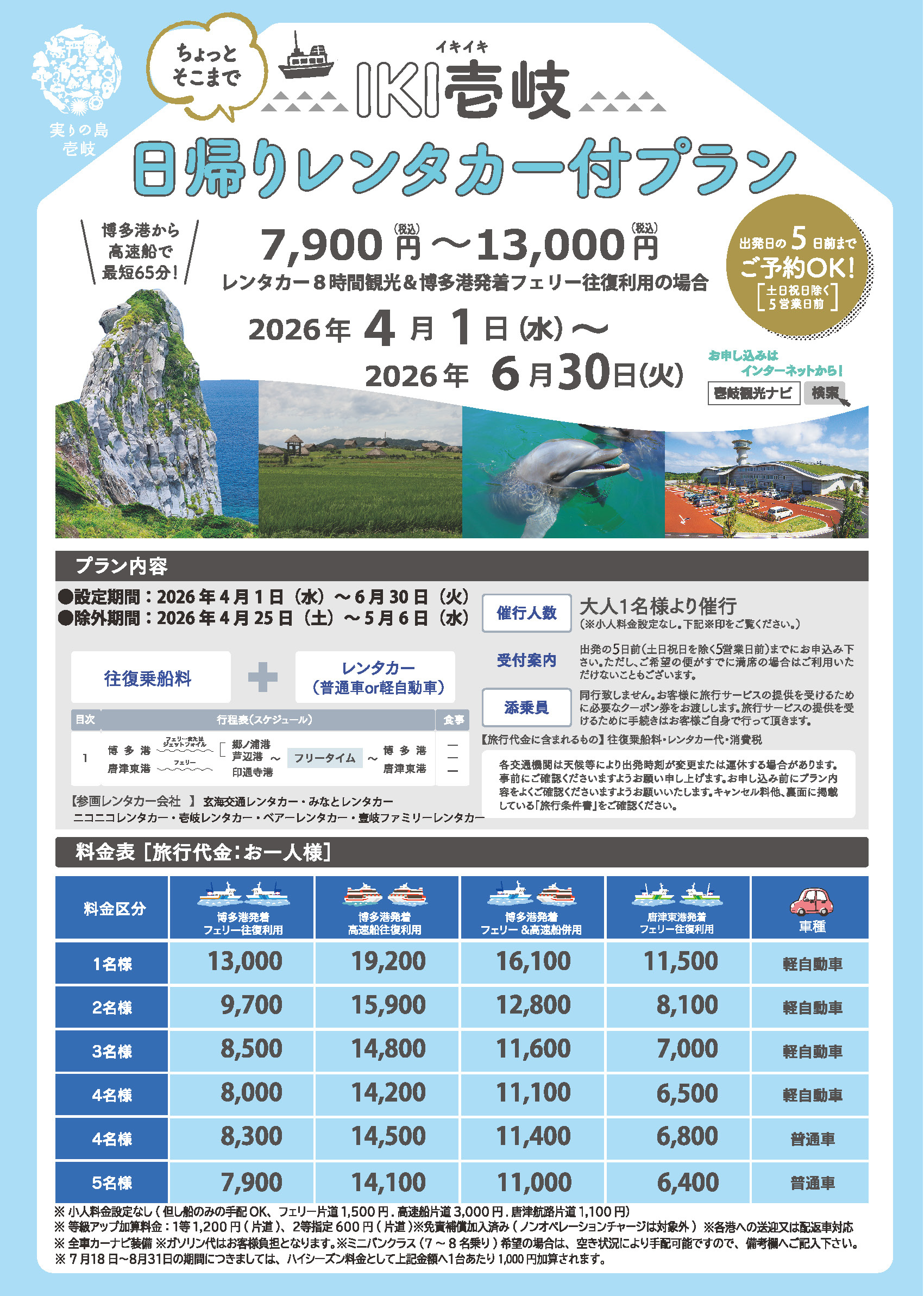 Between Hakata ⇔ Iki, between Karatsu ⇔ Iki round trip boat ticket + rental car set plan