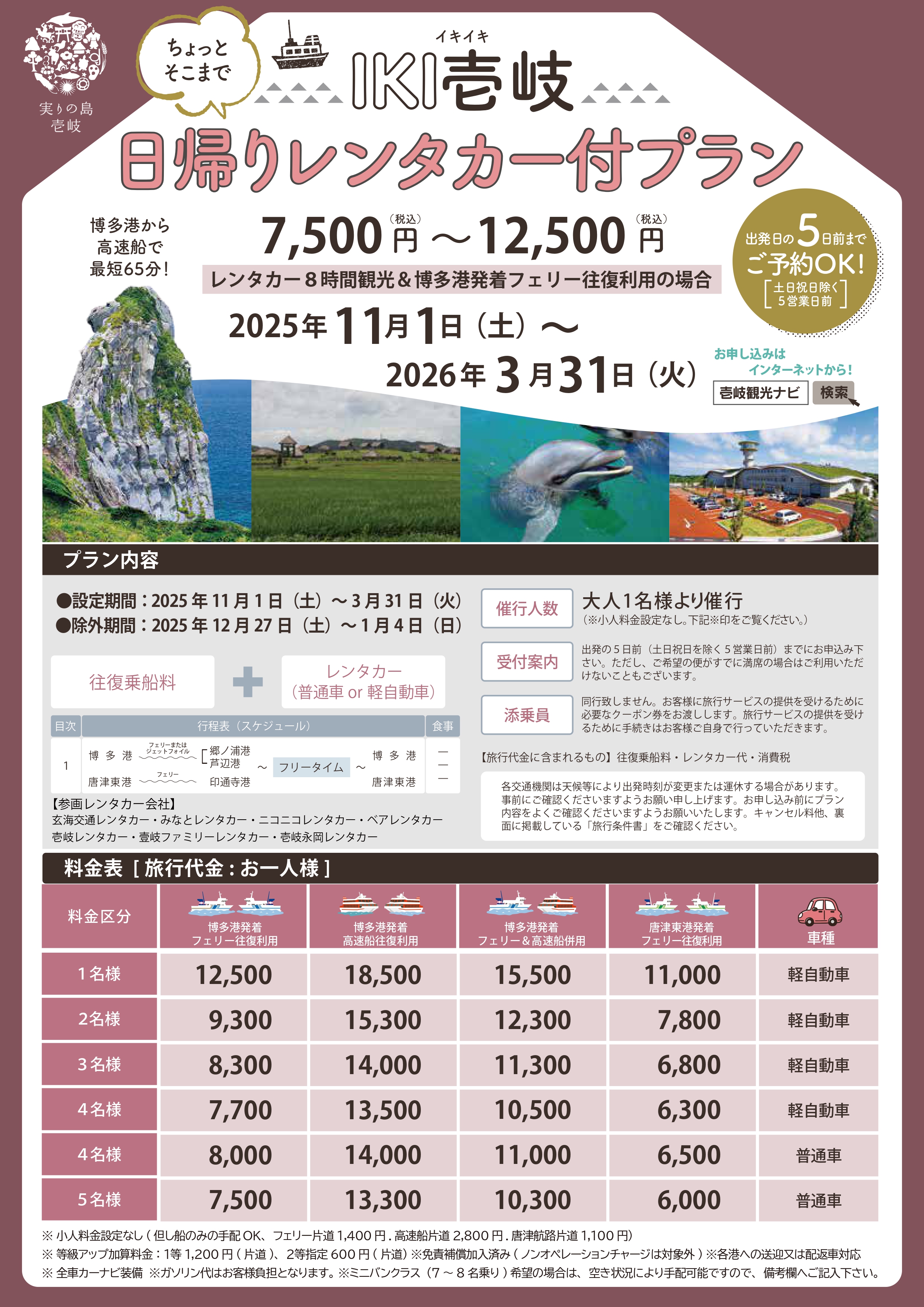 博多⇔壱岐間、唐津港⇔壱岐間 往復乗船券 + レンタカーのセットプラン